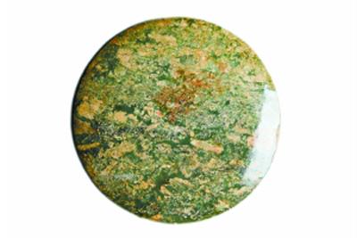 这件西汉青玉镜,就是仿照青铜镜雕琢的,是一件大型的居室陈设器。说它大,是指它比一般的照容青铜镜直径大(直径达30厘米)。它是用玉制作的,镜面光洁度不够,不能照容,只能用来陈设。