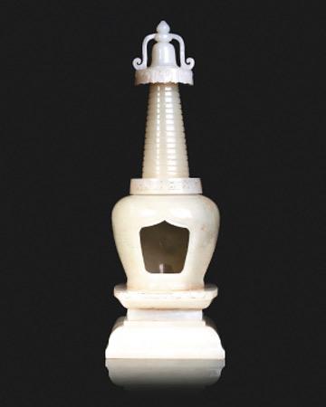 此座乾隆御题诗佛塔,高29厘米,玉质为上好和田玉,油润滋肥,色泽白中泛青,皮张色浆厚实。塔面以行楷镌刻乾隆御题礼佛偈言,近百字,点划精到,书法清隽,蕴含了参禅向善的深意。偈言上方刻有“无量寿佛”四字,端庄大方,开宗明义,主旨突出。又有“鉴古”、“石渠宝笈”等三方印章,据此,可以判断此玉雕佛塔乃清宫宝器,系皇室为诵经参禅而令宫廷造办处专门精心打造的礼佛之物。乾隆皇帝爱玉成癖,他登基时,我国玉雕技艺发展到巅峰时期,在他作的成千上万首诗中,就有四十多首是赞美玉的。这件玉雕佛塔恰恰从一个侧面为乾隆爱玉的雅兴提供了有力的佐证。
