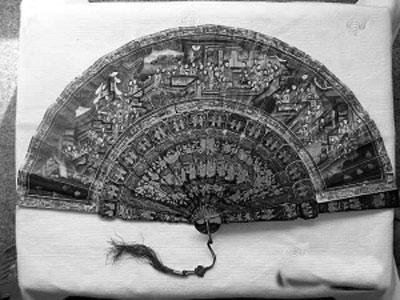 细细把玩品味,会发现这把扇子人物众多,扇面画境气势比较大,扇骨为竹质描金,扇面为纸质印刷图案。既为印刷图案应该是属于晚清时期的作品。扇面上的人物脸庞多为象牙片做成,人物的衣袖服饰也是用各种绢绸细剪而成后贴在上面再绘上相宜的颜色。由这两点看来,这把扇子应该是晚清时期广州竹骨描金画扇的典型工艺品,而且专门外销国外的。虽为工艺品,但因其工艺繁缛,这把扇子也具有极高的收藏价值,可谓是近代广州扇子工艺品的一个杰出代表了。