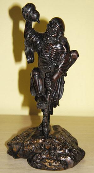 上月在香港荷里活道淘到一件黄花梨雕件,是八仙中的铁拐李头戴戒箍,身着长衣,脚踩云石,左手拄拐杖,右手拿着酒葫芦正酣饮着。细看他面部神态夸张,形态生动,胸口肋骨的雕法还稍带有明晚期的风格。另外全身上着大漆,如果不是身后光滑部分由于年久再加经常擦拭,而露出黄花梨特有的纹路,不然还真看不出什么材质了。清早中期对一些名贵的雕件,经常有上大漆的习惯,以示珍贵,同样也保护材质。此外,下面的云石座,居然用珍贵的楠木瘿随形雕刻,可见对此雕件的重视程度。