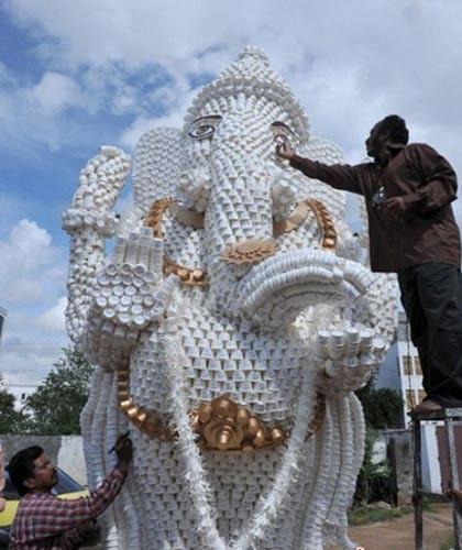 8月29日,在印度海德拉巴,印度艺术家苏利耶·普拉卡什为参加将于9月1日开始的加内什节的神像作最后的装饰。普拉卡什在5名工人的帮助下,用了30000个纸杯制造了这个高17英尺(约5.1816米)的神像,期望此举能最大限度的减少对环境的破坏。