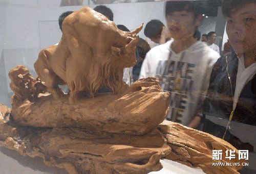 观众在浙江工艺美术大展上欣赏一件名为《梦回唐朝》的根雕作品 |
