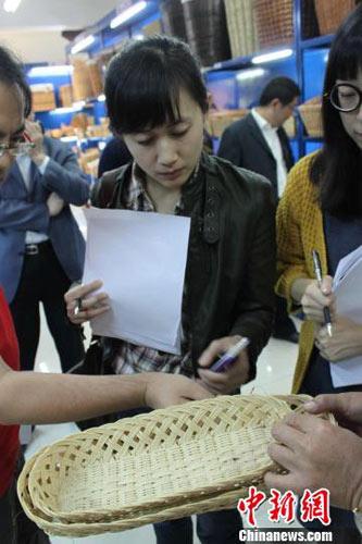 在山东郯城的一家柳编企业的样品展厅,企业人员在为参观者展示一柳条编织的面包篮 |