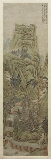这种舒适宁和的格调正是文徵明细笔小青绿山水的典型风格。一小块峰峦合抱的山间平地,在高大苍翠的树木和温厚敦穆的山壁的包围中,坐落着一进小小的院落,茅檐柴扉,窗明几净,虽然是在山野之中,却分外予人一种安全感。屋舍前是山溪水、石板桥,一个策杖的文士带着随侍童子缓缓走来。房子后面的主峰层峦叠嶂,负势竞上,山腰处的寺院隐约可见。由于布局工稳而略带程式化,巍峨的山峰及其繁复的石壁并没有压迫感,而显得稳重而温和。整个画面的笔触非常细腻,山石的皴笔柔和而精致,树木的刻画既富有自然的生意,又略有装饰性的美感。文氏的山水画有简略与精工两种主要风格,后世有“粗文”、“细文”之分,而尤以“细文”为画史所重。就风格来看,此件《秋山觅句图》当属典型的“细文”作品,而更加难得的是,这幅“细文”还是用文徵明最擅长、最知名的小青绿画法所作。