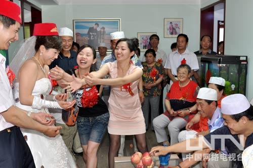 回族婚礼过程中,阿訇给一对新人诵经祝福后,把花生、栗子、枣抛向新郎、红娘,喻意生男生女,多子多福。一对姐妹上前接取花生等物品,分享喜悦和快乐。