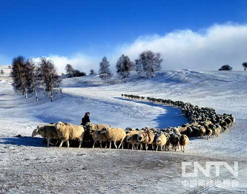 鱼塘封冻,小屋里燃起的炊烟在林木和白雪的映衬下给人以灵动和遐想。