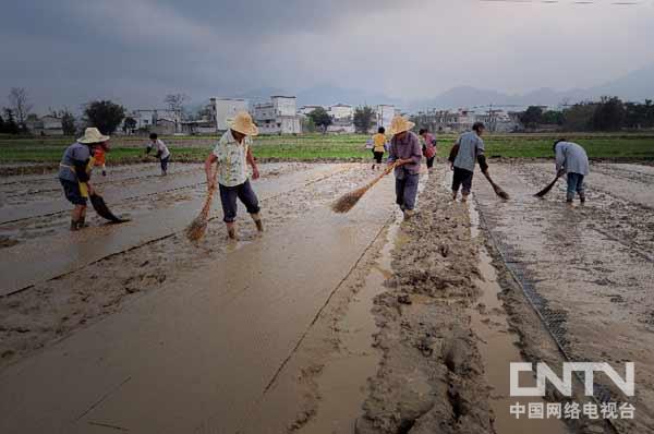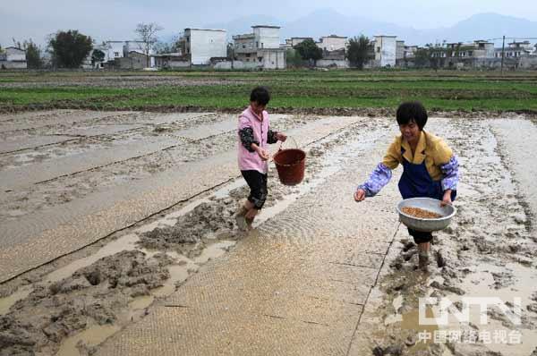 现代农民注重科学种田,精心育秧,力保亩产增收。