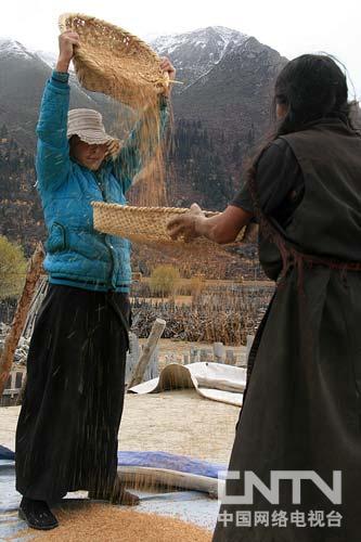 西藏然乌糊畔的藏民丰收的青稞,利用自然世界的风力打扬青稞,自然默契。