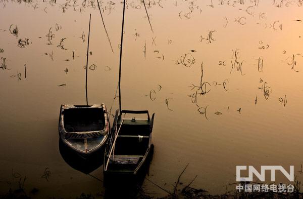一池春水,两只小船,疏密有致的草儿,扎根在港湾。
