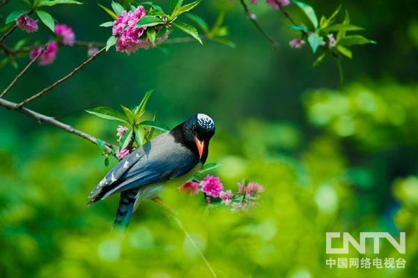 那天我们去拍花,一只红嘴蓝鹊飞到桃花树上,赶紧抓拍,就有了这张照片。