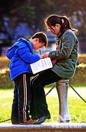 孩子趴在妈妈身上写作业,令人感动的一幕。